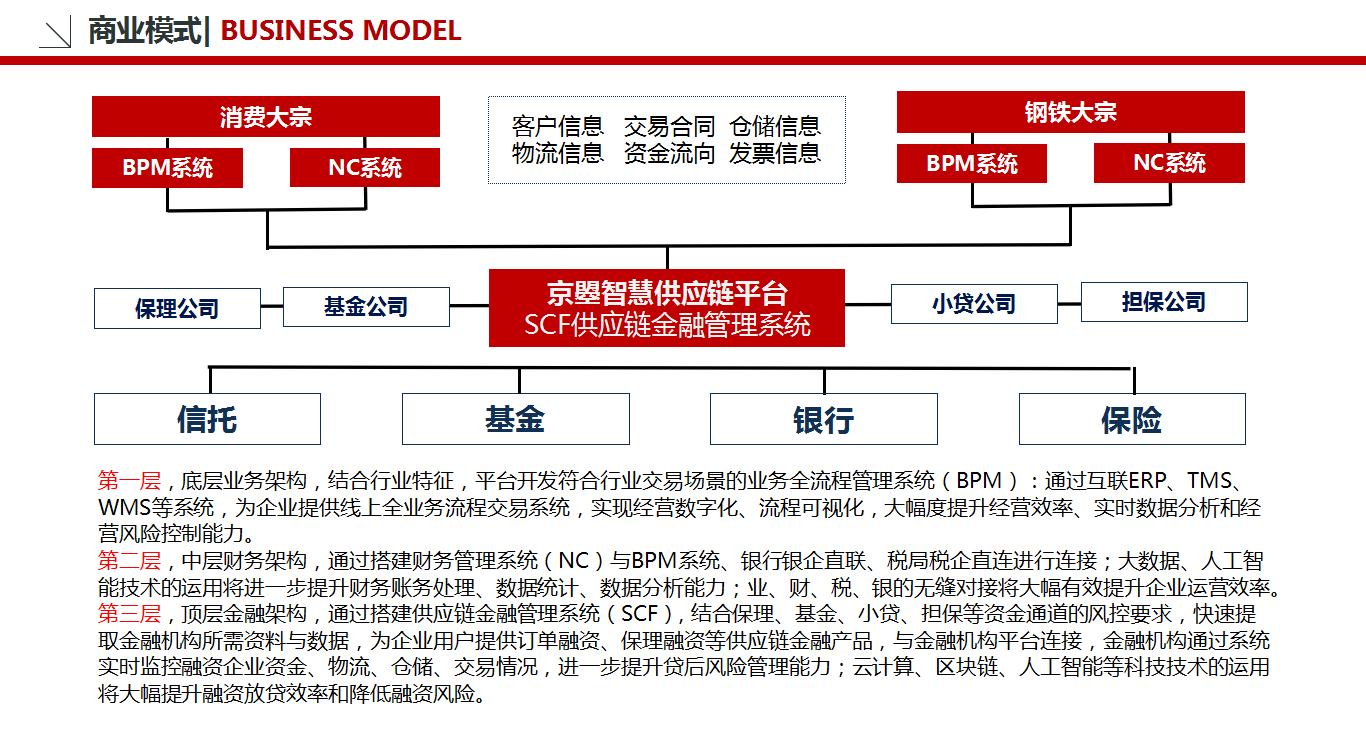 洛陽京曌供應(yīng)鏈管理有限公司成立于2017年8月,是一家以互聯(lián)網(wǎng)、大數(shù)據(jù)、區(qū)塊鏈、人工智能、供應(yīng)鏈金融為核心的智慧供應(yīng)鏈金融服務(wù)平臺,平臺圍繞消費大宗、鋼鐵大宗等產(chǎn)業(yè)的發(fā)展,通過搭建業(yè)務(wù)全流程管理系統(tǒng)(BPM)、財稅管理系統(tǒng)(NC)、供應(yīng)鏈金融管理系統(tǒng)(SCF),以數(shù)字化方式實現(xiàn)資產(chǎn)端業(yè)務(wù)、財務(wù)、稅務(wù)全流程管理,建立上達(dá)資金下通資產(chǎn)的智慧供應(yīng)鏈管理平臺,平臺旨在通過科技技術(shù)幫助金融機(jī)構(gòu)尋找最優(yōu)質(zhì)、最安全的資產(chǎn)端,為資產(chǎn)端提供最高效、成本最低的融資途徑;實現(xiàn)金融機(jī)構(gòu)與企業(yè)共生發(fā)展。